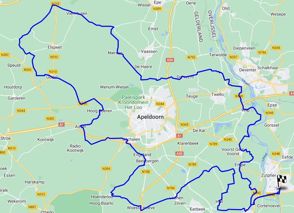 Met een totale lengte van 150 km ben je volgens TomTom zo'n 3 uur zoet (inclusief Beekbergen's kwartiertje).